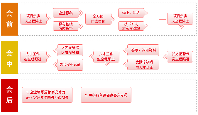 | 服務(wù)流程更清晰,服務(wù)體系更完善。所有參會(huì)人才經(jīng)我方人才顧問(wèn)篩選后,現(xiàn)場(chǎng)由獵頭助理引領(lǐng)至參會(huì)企業(yè)處洽談,從而保障參會(huì)效果。 | ||||||||||||||||